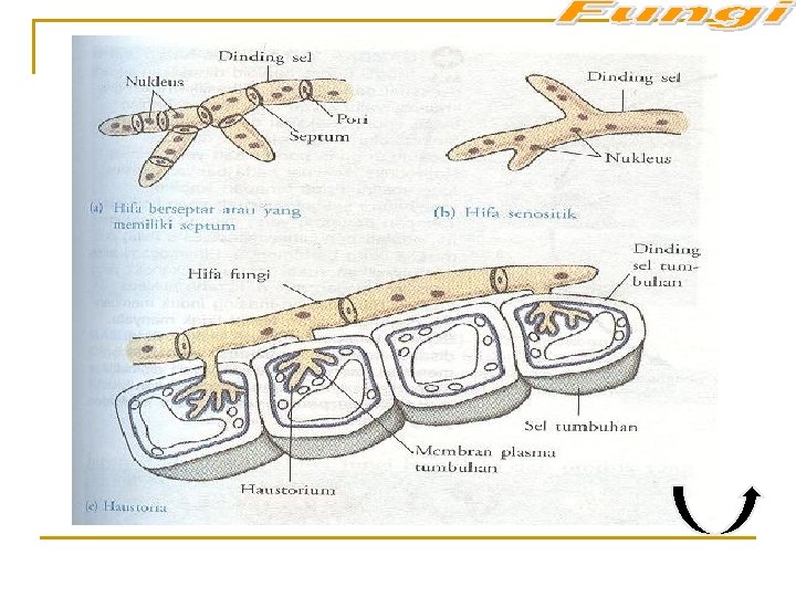 Struktur dan Fungsi Tubuh n n n n Hifa/hifae benang-benang halus Septum/septa sekat / dinding Hifa senositik hifa yg tdk berseptum Miselium/miselia hifa yg bercabang membentuk anyaman Miselium vegetatif menyerap makanan Miselium generatif menghasilkan spora next Houstorium/houstoria ujung hifa