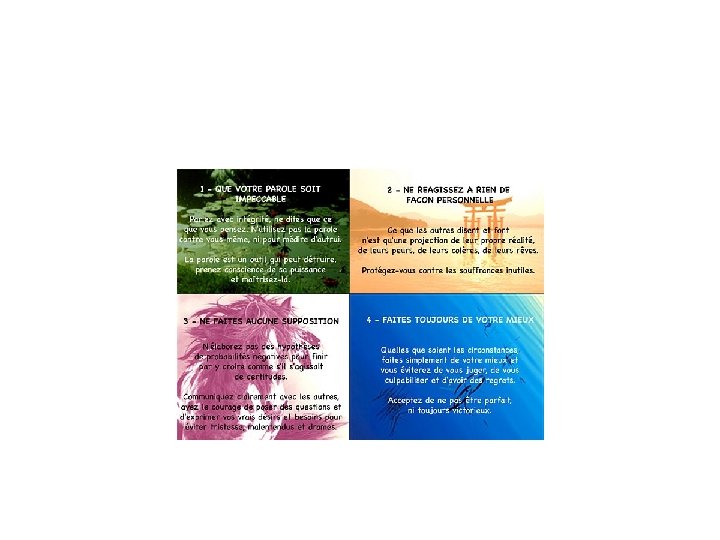 Que ta parole soit impeccable • «Vous pouvez évaluer le degré auquel votre parole est impeccable à l’aulne de l’amour que vous avez pour vous-même. L’intensité de votre amour-propre et les sentiments que vous nourrissez envers vous sont directement proportionnels à la qualité et à l’intégrité de votre parole. Lorsque celle-ci est impeccable, vous sentez bien ; vous êtes heureux et en paix. »