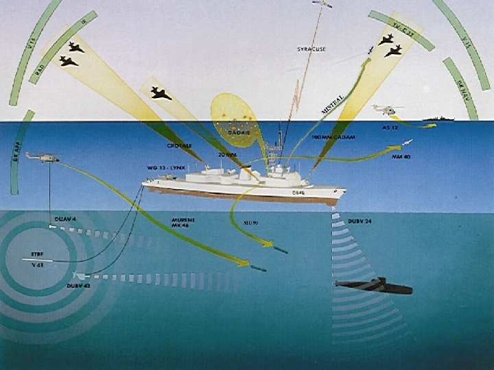 La lutte anti-sous-marine Armes: Torpille MU 90 Portée : 15 kilomètres Moyens de détection : – Sonar d’étrave actif – Sonar remorqué actif – Antenne remorquée passive
