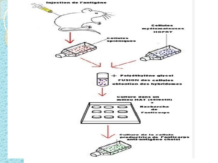 �Cette technique consiste à injecter l'antigène d'intérêt chez une souris puis de prélèver, au bout de quelques semaines, les cellules de la rate. Parmis cellules se trouvent des plasmocytes sécrétant des anticorps dirigés spécifiquement contre l'antigène choisi. On fusionne ces plasmocytes avec des cellules de tumeur appelées cellules myélomateuses (cellules immortelles) grâce à l'addition de polyéthylène glycol (PEG) qui induit la fusion membranaire et permet ainsi d'obtenir des hybridomes qui ont la capacité de se multiplier plus rapidement que les cellules normales du corps productrices d'anticorps et de développer indéfiniment des anticorps spécifiques. Les cellules sont ensuite réparties dans des plaques multipuits de telle sorte qu'il n'y ait qu'une cellule par puits.