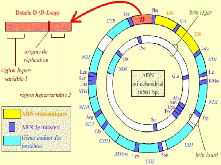 n n L’ADN mt humain, une molécule circulaire qui a été entièrement séquencée, Il contient 16 569 pb Possède 13 séquences qui commence par un codant ATG (méthionine) se termine par un codant stop et sont suffisamment longues pour coder un polypeptide de plus de 50 AA Contrairement à l’ADN nucléaire, il est dépourvu d’introns et ne contient pas de longues séquences codantes. K Sifi