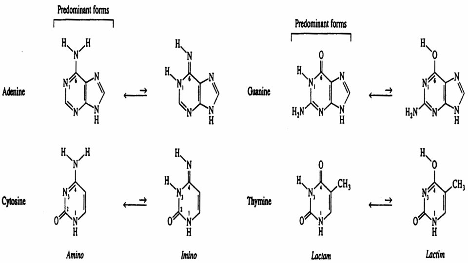 Forme céto ou lactame de la thymine Forme céto ou lactame de la guanine Forme énol ou lac time de la thymine