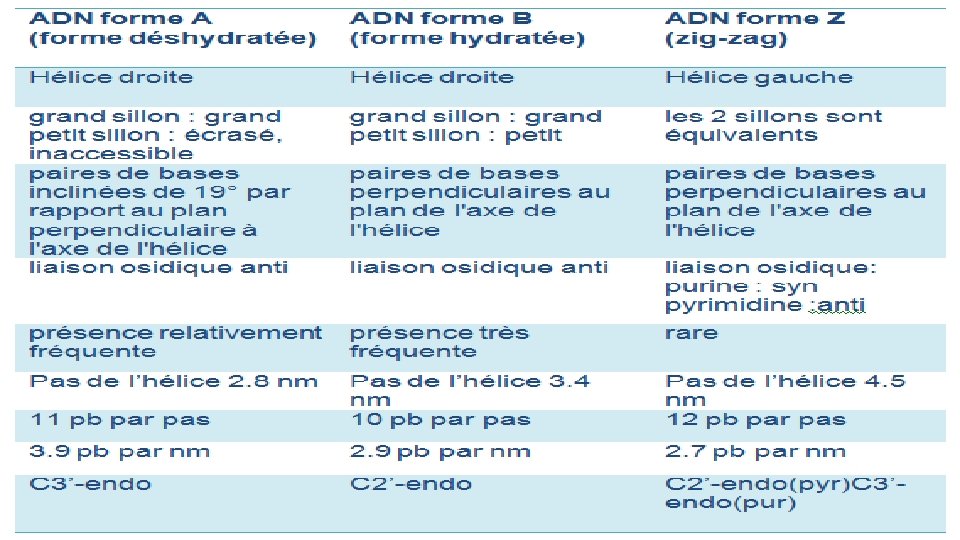 3 types de conformations de l'ADN A, (B) et Z