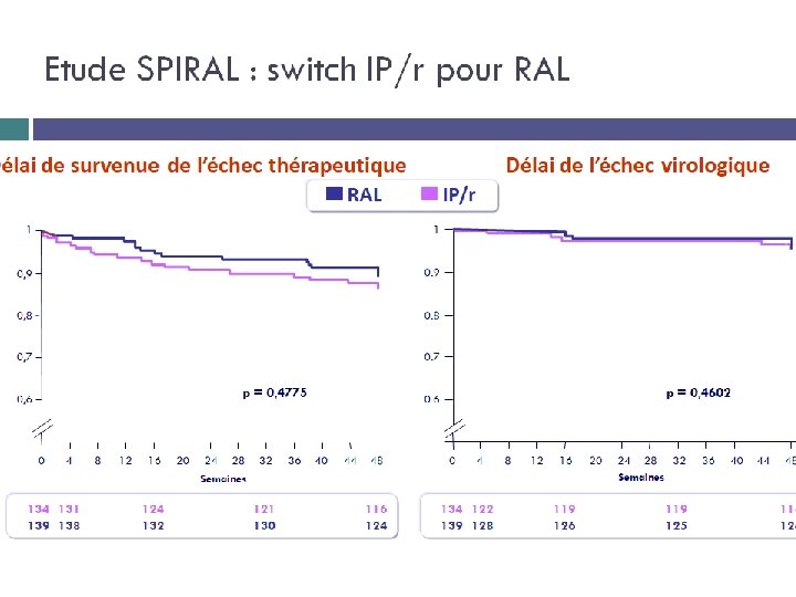 Etude SPIRAL : switch IP/r pour RAL Randomisation* 1: 1 Sans insu VIH ≥ 18 ans Sous 2 ARV + IP/r CV < 50 c/ml > 6 mois** Naïfs de RAL SPIRAL S 48 n = 142 Switch pour RAL 400 mg bid + poursuite des ARV n = 140 Poursuite IP/r + autres ARV Martinez E, AIDS 2010; 24: 1697 -1707