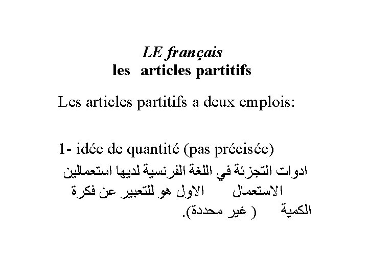 Les articles partitifs • Il bois de l’eau. • Pour pluriel on utilise (des). • Elle voudrait des épinards.