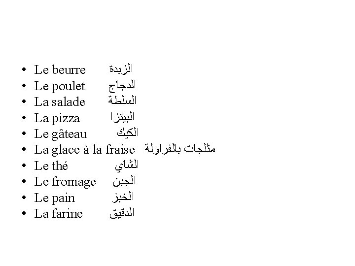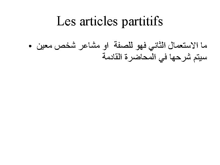 Les articles partitifs Pour masculin singulier on utilise( du). Je mange du poulet. Pour féminin singulier on utilise (de la). Je mange de la salade. Pour masculin , féminin singulier commence par une voyelle ou (H) muet on utilise (de l’).