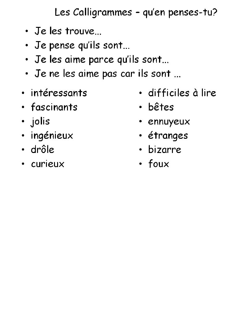 Regardez nos Calligrammes - qu'en pensez-vous? Je préfère celui de ______ parce que c'est _______ et _______. Lequel vaut un mérit? (ou deux? !)