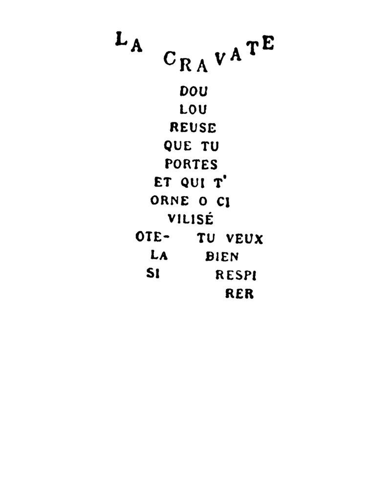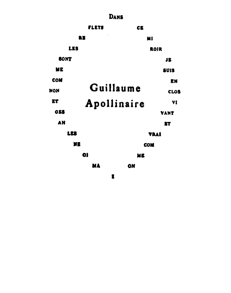 IL PLEUT Voici le texte d'un de ses poèmes - est-ce que vouz pouvez le mettre dans un calligramme? Le texte: Il pleut des voix de femmes comme si elles étaient mortes même dans le souvenir c’est vous aussi qu’il pleut, merveilleuses rencontres de ma vie. ô gouttelettes ! et ces nuages cabrés se prennent à hennir tout un univers de villes auriculaires écoute s’il pleut tandis que le regret et le dédain pleurent une ancienne musique écoute tomber les liens qui te retiennent en haut et en bas Translation by Roger Shattuck: It’s raining women’s voices as if they had died even in memory And it’s raining you as well marvellous encounters of my life O little drops Those rearing clouds begin to neigh a whole universe of auricular cities Listen if it rains while regret and disdain weep to an ancient music Listen to the bonds fall off which hold you above and below