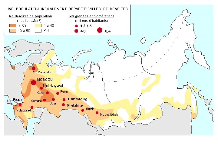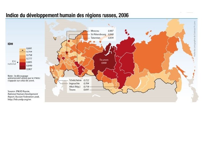 Forte attractivité migratoire du fait de la présence d’activités d’extraction des hydrocarbures IDH élevé et forte croissance économique Intégration intense à l’économie monde via les oléoducs Région de Tioumen Faible peuplement mais en croissance Ressources abondantes et fortes contraintes naturelles Logique pionnière de mise en valeur du territoire héritée de l’époque soviétique avec une urbanisation rapide et élevée Une région en plein développement …
