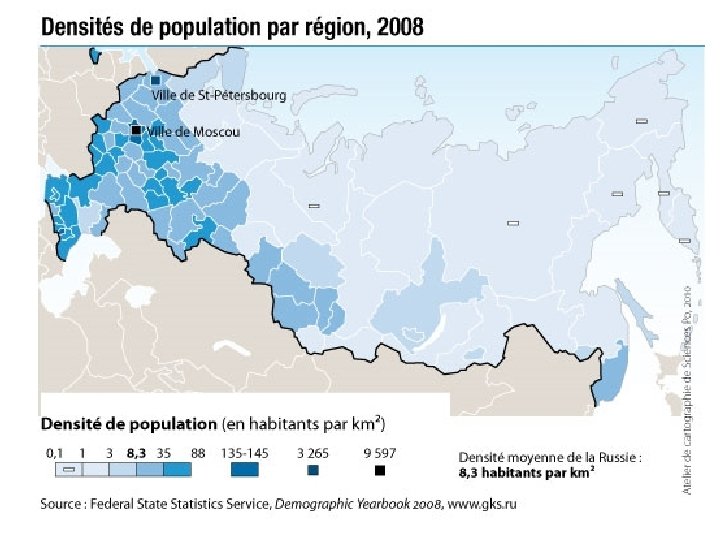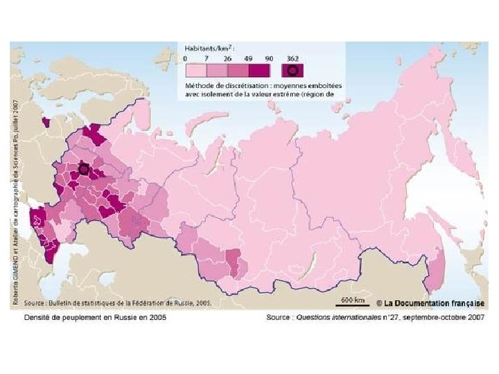 c Les statistiques servant de base à la cartographie des minorités sont loin d’être faciles à interpréter, donc à cartographier • Il existe de nombreux individus issus de milieux « mixtes » c c’est le sentiment d’appartenance à une minorité qui les amènent ou non à se déclarer non. Russes c On peut changer d’appartenance d’un recensement à l’autre. • Les statistiques sont du coup faussés par des aléas c En 1989, 842 000 habitants se déclarent de nationalité allemande. c De 1989 à 2002, on dénombre 676 000 départs définitifs vers l’Allemagne ( « loi du retour » en Allemagne) c En 2002, le recensement dénombre 597 000 « Allemands » ó il semble qu’entre-temps de nombreux Russes se sont découverts des origines allemandes pour pouvoir bénéficier de la législation allemande sur l’immigration. • Le recensement est un enjeu politique = les autorités régionales ou fédérales manipulent les chiffres c en 2002, le président de la République du Bachkortostan a donné l’ordre aux recenseurs de porter la part de Bachkirs à 30 % pour « préserver la souveraineté de la République » c Après la 2ème guerre de Tchétchénie (recensement de 2002), la République ne voit pas sa population baisser alors que celle de l’Ingouchie voisine explose les chiffres concernant la Tchétchénie nient nettement l’afflux de réfugiés vers l’Ingouchie Volonté d’alimenter la thèse officielle d’une « normalisation » de la situation dans la République sécessionniste après la reprise en main par Moscou.