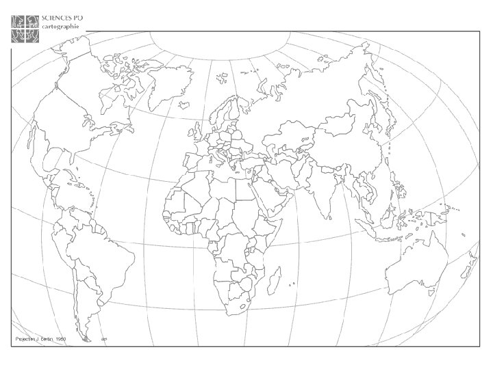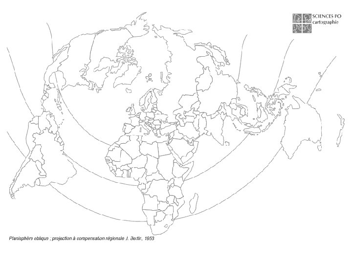 Exemples de Type de projection Avantages / Inconvénients Contexte d’utilisation Mercator (1569) Projection dite cylindrique conforme Respecte les angles entre méridiens et parallèles mais déforme les surfaces Surreprésentation de l’hémisphère nord et déformation considérable des pôles Répondre aux besoins de la navigation dans les zones tropicales lors de la première mondialisation Colonisation et domination de l’Occident Domination du Nord sur le Sud Peters (1973) Projection dite cylindrique équivalente Conserve les superficies relatives entre les continents mais modifie leurs formes Fréquemment corrigée par Behrmann pour rétablir les formes des continents du Sud Met en valeur le Tiers-monde Projections utilisées prioritairement à l’époque du tiers-mondisme Lambert (1764) Projection dite conique conforme avec des méridiens en droites concourantes Ne fausse pas les formes Déforme les méridiens les plus éloignés du méridien choisi comme origine Permet l’étude des zones polaires Utilisé dans le contexte de la guerre froide qui opposait deux puissances nucléaires qui avaient pour frontière stratégique l’Arctique (missiles) Relativement fidèle aux rapports de superficie entre les continents Rétablit l’idée de la sphéricité de la terre Utilisée pour la géographie de la mondialisation Décentre le regard par rapport aux visions occidentalo-centrées et rend visible la proximité entre l’Asie et l’Amérique du Nord Bertin (1950 & 1953) Choix d’un type de projection n’est pas neutre : il est porteur de postures idéologiques et influe sur la représentation qu’on peut se faire de la réalité du monde et de l’espace