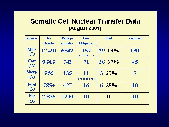 Importance des facteurs « épigénétiques » La gamétogenèse dure des semaines (spermatogenèse) ou des années (ovogenèse) Dans le cas du transfert nucléaire, la reprogrammation épigénétique du noyau somatique dure de quelques minutes à quelques heures au maximum. Dérégulation imprévisible dans l’expression de gènes précoces du développement.