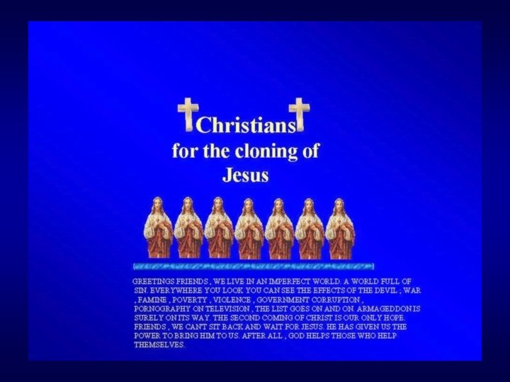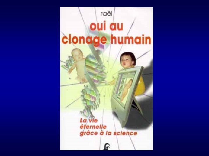 Les raisons d’interdire le clonage reproductif humain Ø Ce n’est pas une nécessité pour combattre la stérilité. Ø Aucun progrès scientifique, aucune nouvelle connaissance ne peuvent etre attendus de cette technique. Ø Risque MAJEUR. Ø Prédétermination de l’enfant « cloné » . Ø Disparition de l’altérité, prédominance de l’identité de soi. « Le clonage reproductif est un acte d’arrogance sans aucune nécessité médicale » René FRYDMAN, Le Nouvel Observateur, 19 décembre 2002 « Le clonage humain est tout simplement criminel » Norman ZINDER, Université Rockefeller, NY