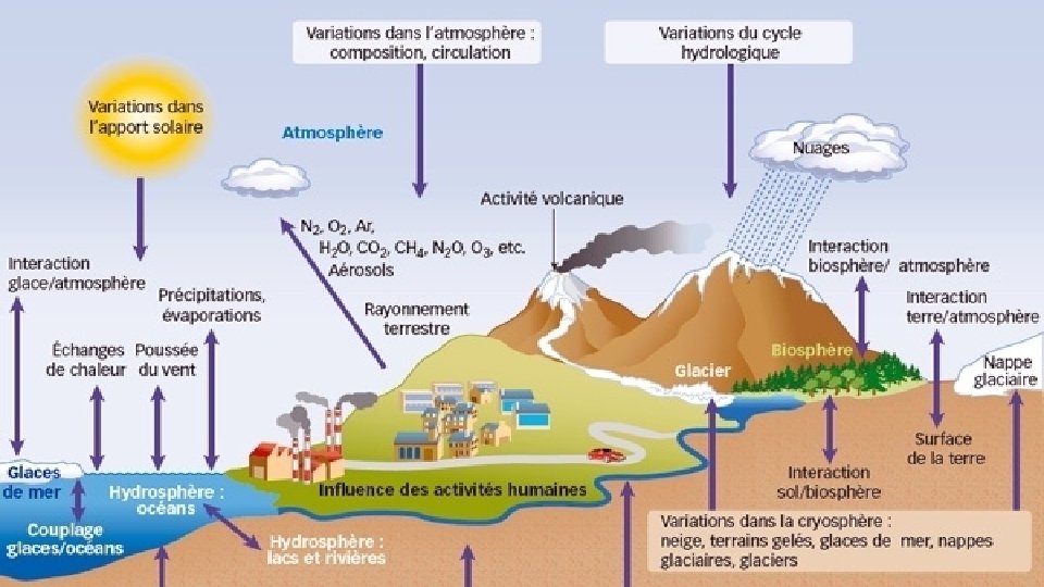 FACTEURS DES CHANGEMENTS DE L'ATMOSPHÈRE • Les changements dans l’activité solaire et volcanique ne contribuent que pour une faible partie du réchauffement climatique au cours de l’ère industrielle. • Le forçage radiatif: - a mené à une accumulation nette d’énergie dans le système climatique; - est associé à l’augmentation de concentration des gaz à effet de serre; • Le forçage radiatif anthropique total, depuis 1750, est positif.