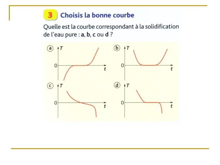 d) Conclusion A quelle température l’eau gèle t’elle ? - L’eau se solidifie à 0°C. Comment évolue la température durant le changement d’état ? - La température reste constante durant toute la solidification d’un corps pur.