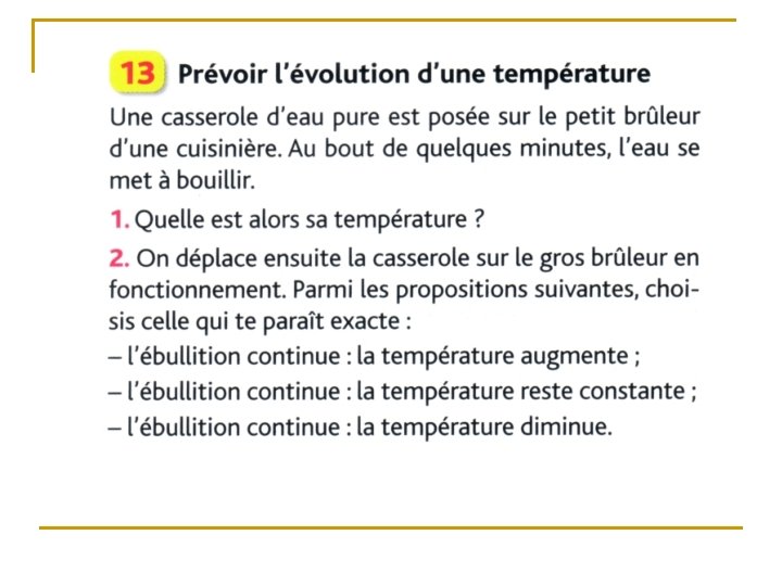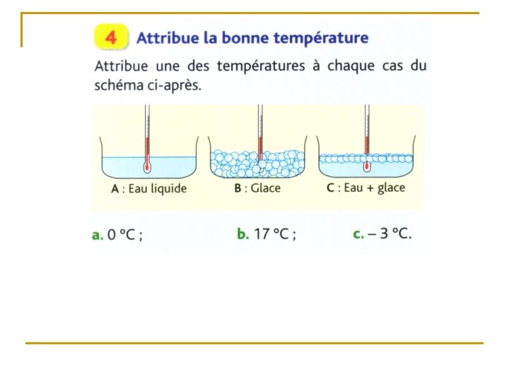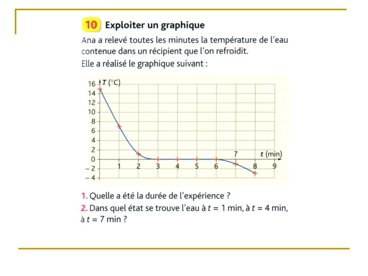 c) Exploitation graphique T° (°C) Évolution de la température pendant la fusion de l’eau Échelle : Abscisse : 1 cm Ordonnée : 1 cm 0 10 s 1 °C t (s) TBI