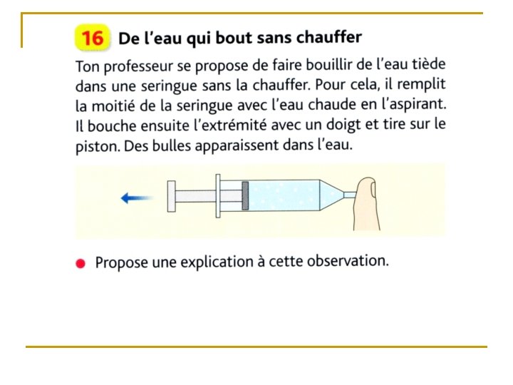 b) Sous une autre pression. Expérience : On détend de l’eau chaude dans une seringue L’eau se met à bouillir, pourquoi ? Car sous une pression faible l’eau bout à moins de 100°C
