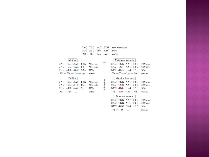 � L’insertion ou la suppression de nucléotides mène à une mutation nommée mutation par décalage de séquence. � Ces types de mutations modifient l’ensemble de la lecture du gène. � Parfois, elles peuvent s’annuler. � Habituellement, cependant, il y a une mutation non-sens. � Voir figure 9. 3 p. 287.