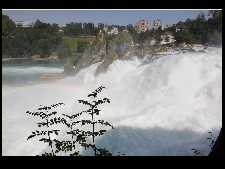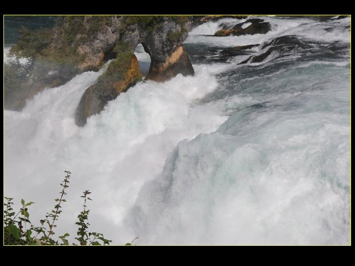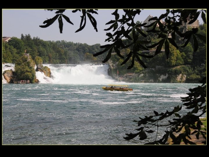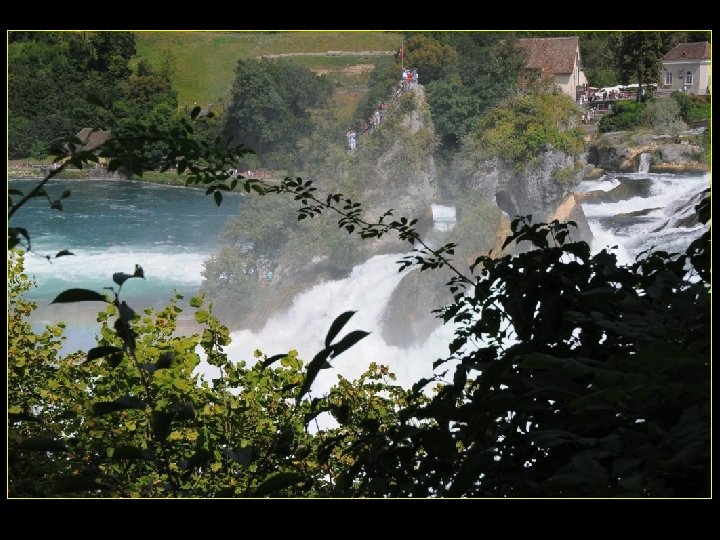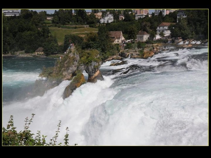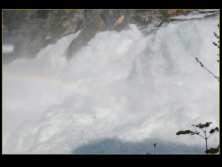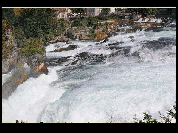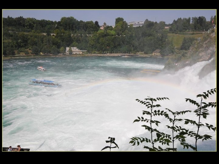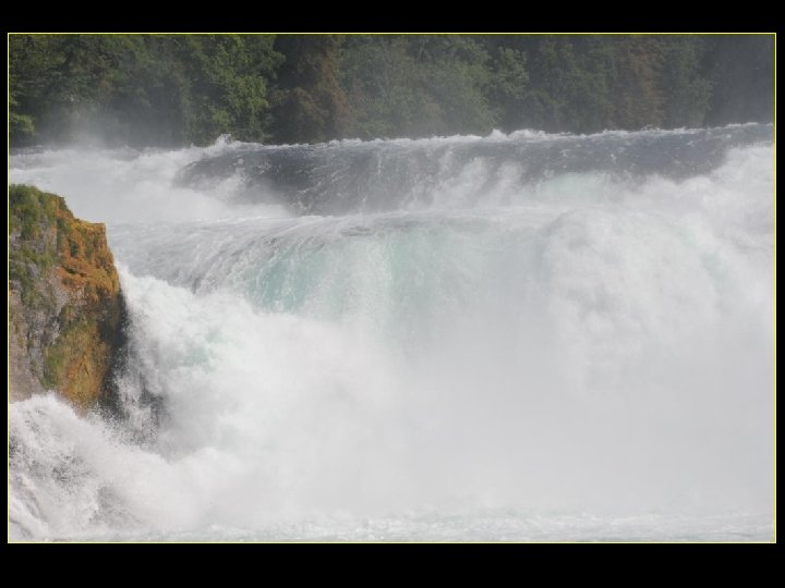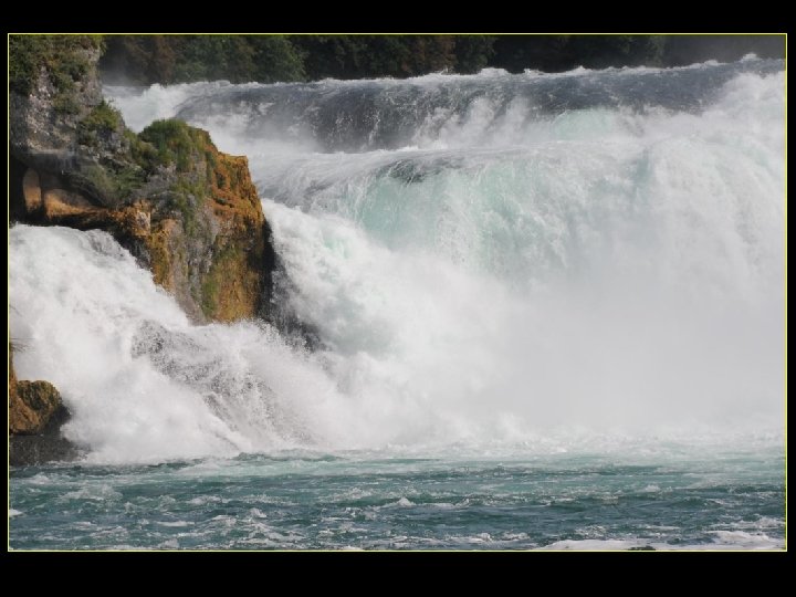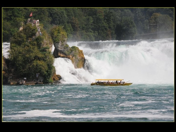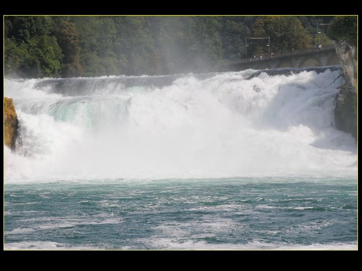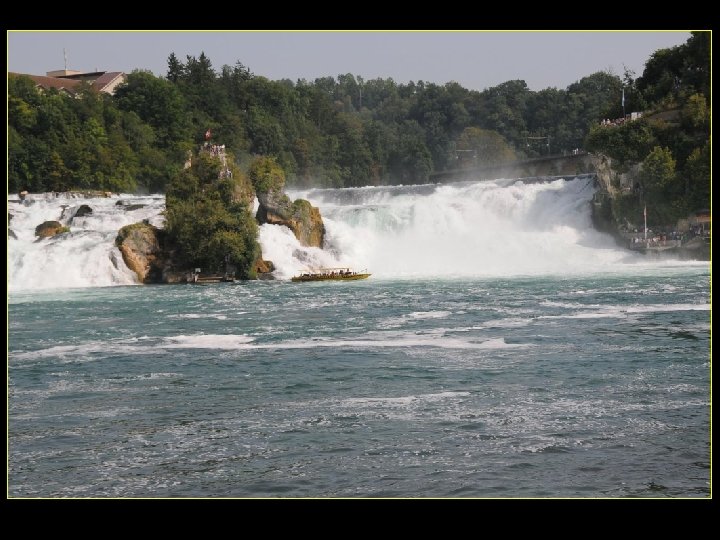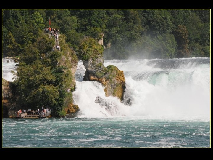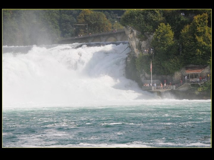Lorsque le Rhin a son débit moyen Ce sont 750 mètres de cubes d’eau par seconde Qui franchissent les rochers d’une Hauteur de 23 metres et sur 150 metres De largeur