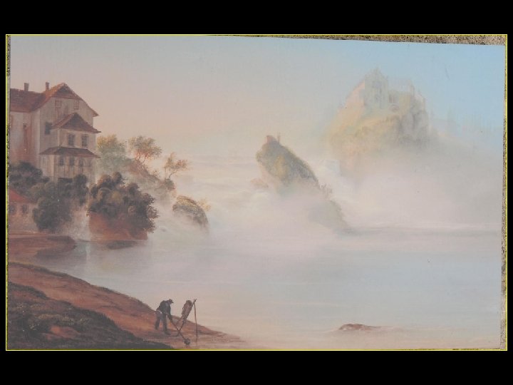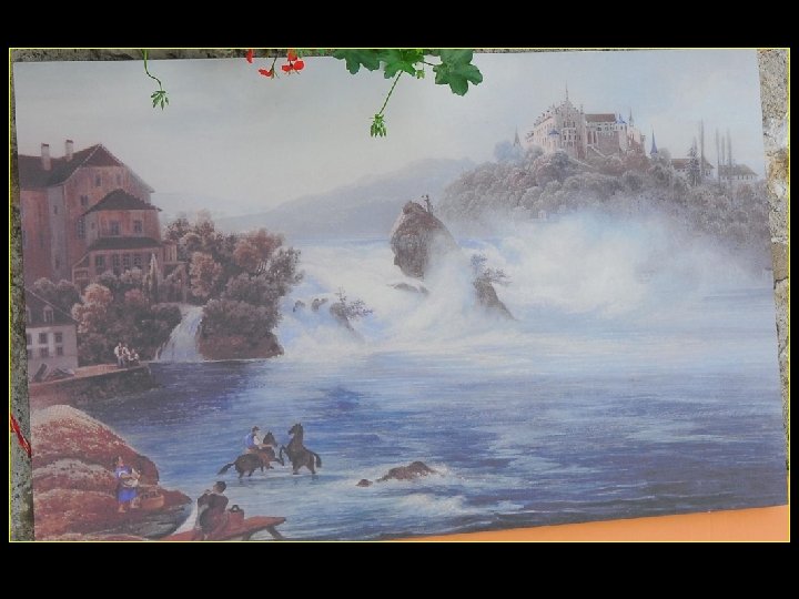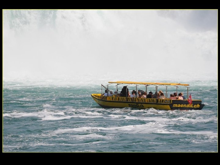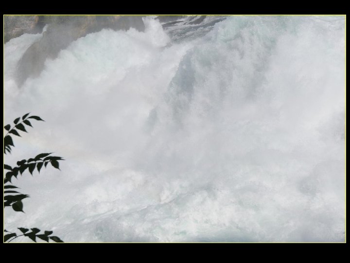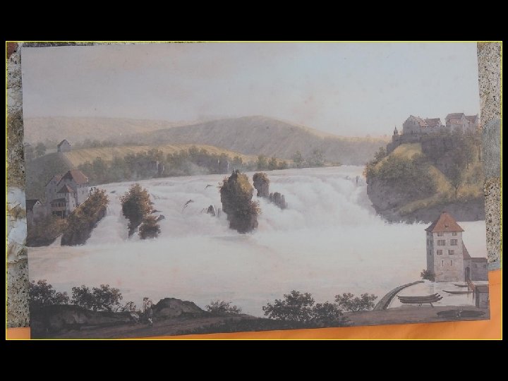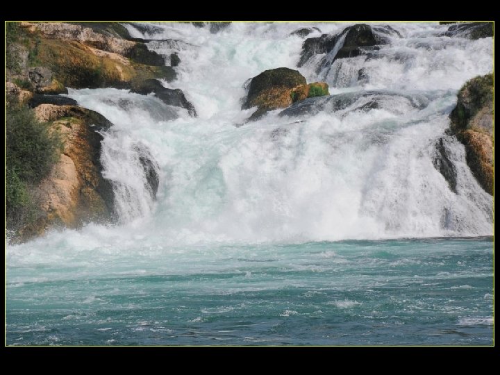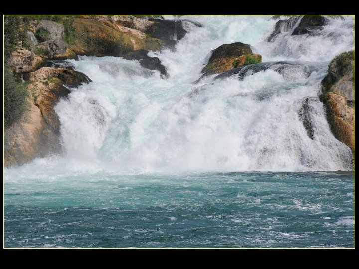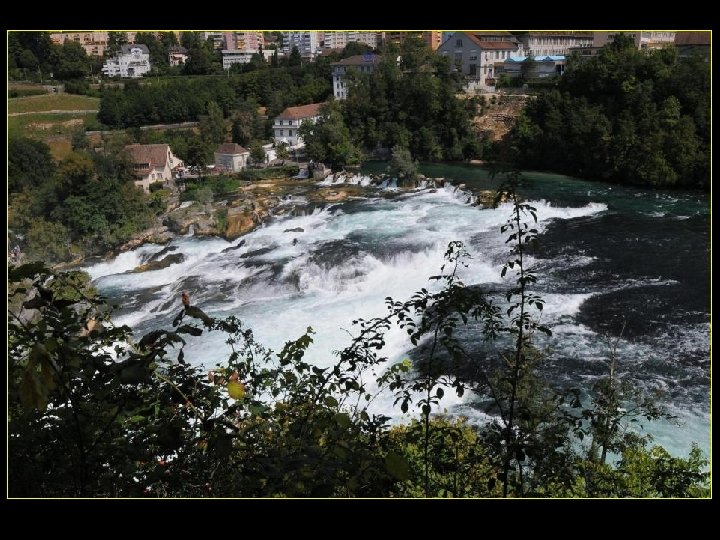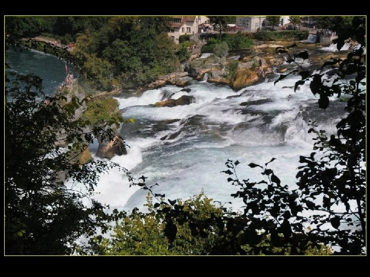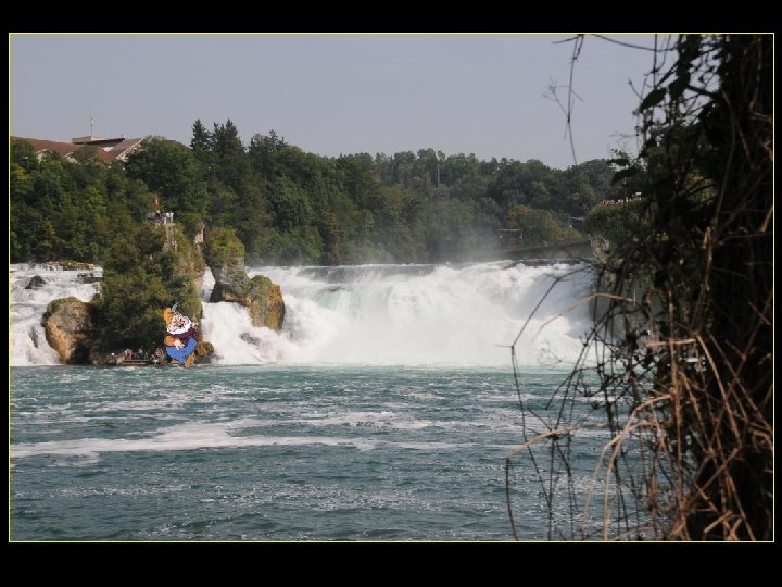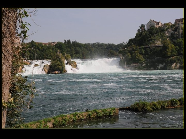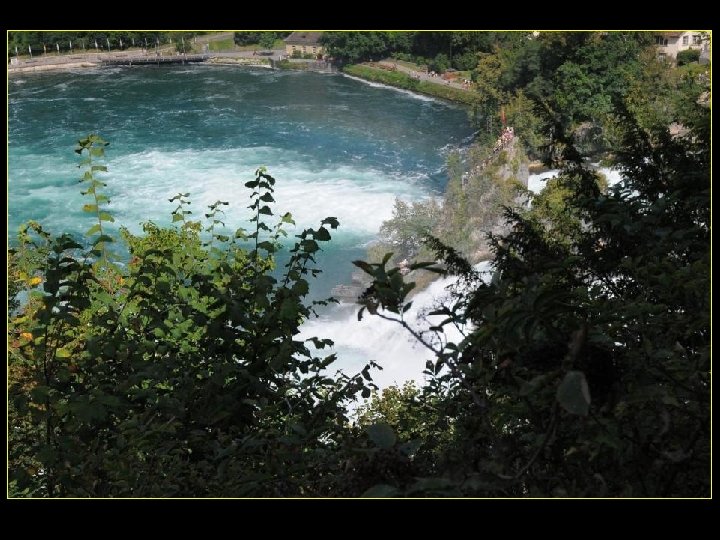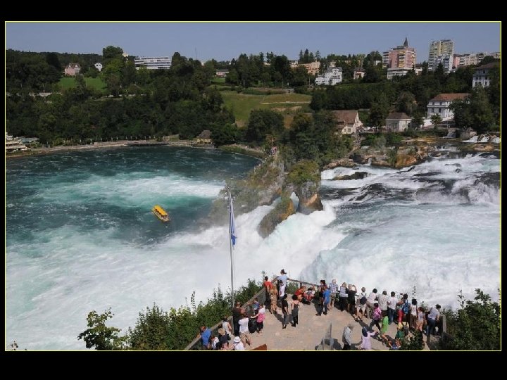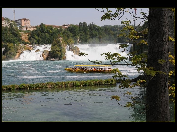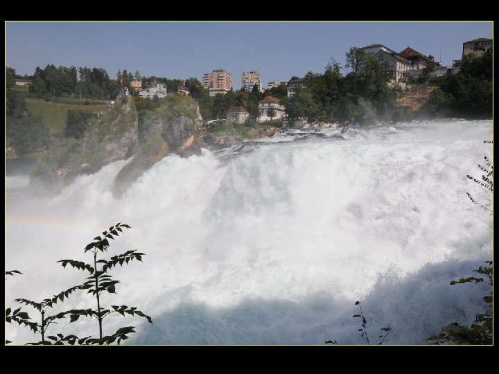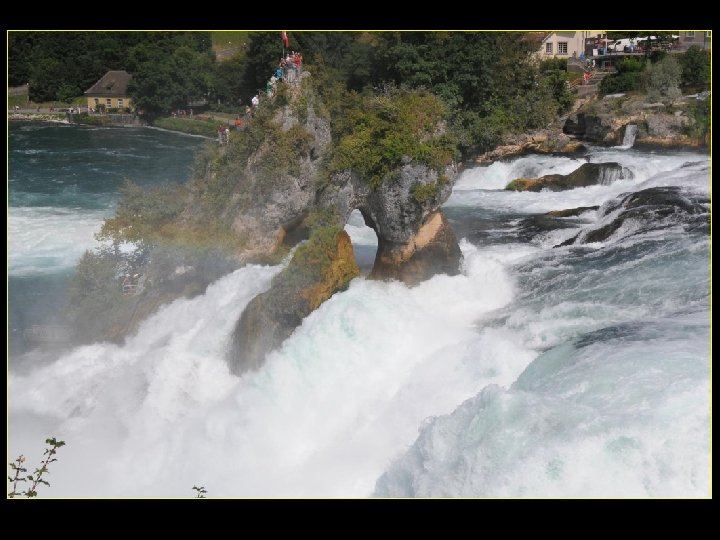 Lorsque le Rhin a son débit moyen Ce sont 750 mètres de cubes d’eau par seconde Qui franchissent les rochers d’une Hauteur de 23 metres et sur 150 metres De largeur