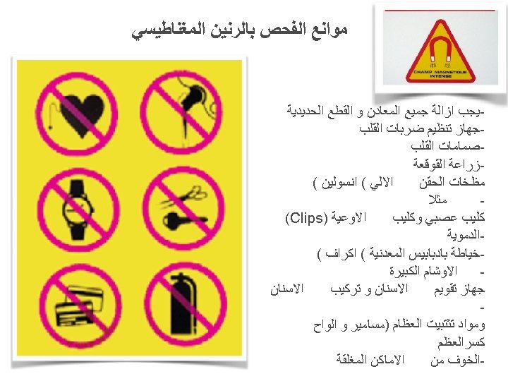 LES CONTRE-INDICATIONS DE L’IRM Les contre-indications formelles sont : • Le port d’un pacemaker-Pile cardiaque • Le port de certaines valves cardiaques et stents • Les implants cochle aires • Les neurostimulateurs • Le mate riel d’injection automatise e implante (pompe a insuline) • Les corps e trangers intra oculaires (en cas de doute, une radiographie du cra ne de face est demande e avant de passer l'examen) • Clips neuro chirurgicaux et vasculaires • Gadolinium pour femmes enceintes et insuffisants rénaux. Les contre-indications relatives et a l’appre ciation du radiologue : • Sutures avec fils me talliques ou agrafes • Tatouage si antenne de surface sur zone a e tudier • Mate riel d’orthodontie, prothe ses dentaires • Les prothe ses articulaires et matériel d’oste osynthe se (vis et plaques pour fracture ou oste otomie) • Eclats métalliques • Claustrophobie.
