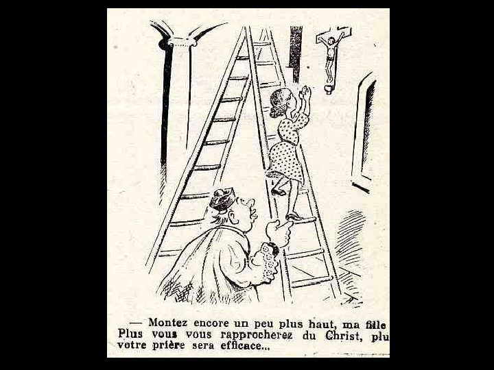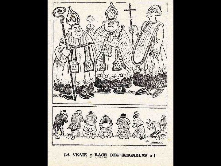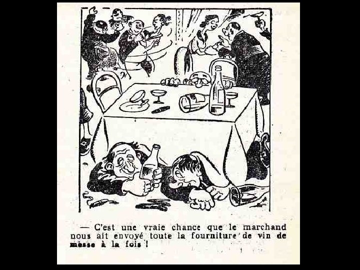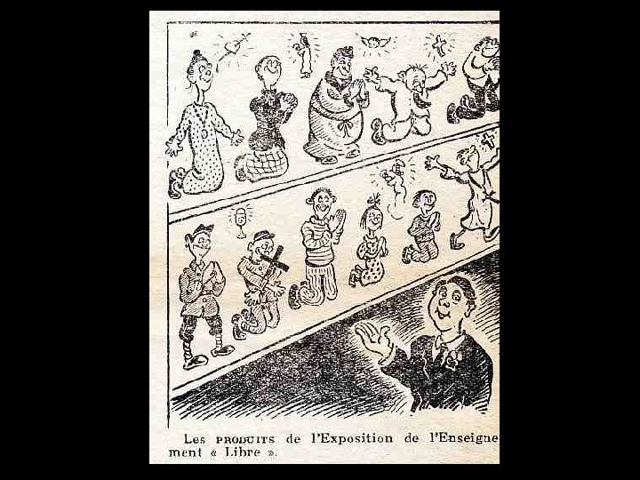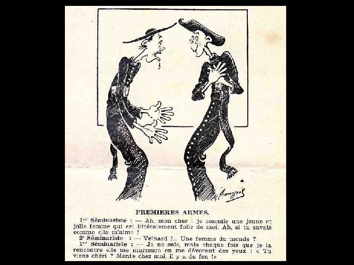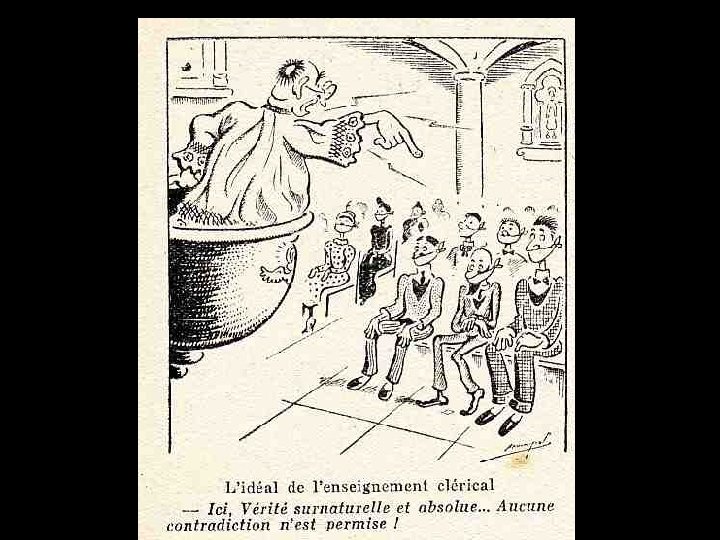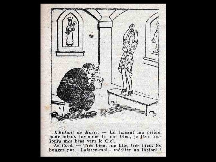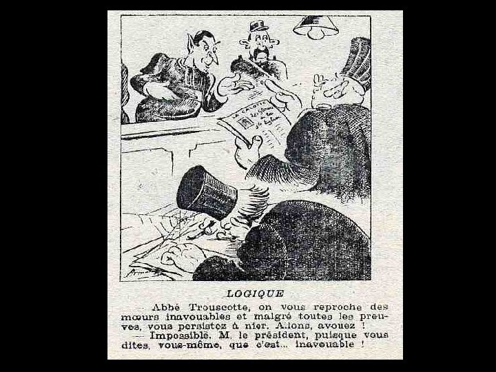DESSINS SATIRIQUES ANTICLÉRICAUX 1900 > 1950 La caricature anticléricale existe dans notre pays depuis fort longtemps, que ce soit sous la forme de textes ou de dessins. Déjà au XIIIème siècle, dans le Roman de Renart, le conteur amuse son auditoire aux dépens du prêtre (marié !) que Tibert le chat prive de ses attributs virils d’un coup « de sa dent acérée » . Au XVIème siècle, Rabelais se délecte à raconter avec force détails la mésaventure d’un cordelier qui « disait la messe des Messires » et qui, devant son auditoire attentif, exhiba malencontreusement ce qu’il aurait dû tenir caché, suscitant le rire et les sarcasmes de l’assistance.
