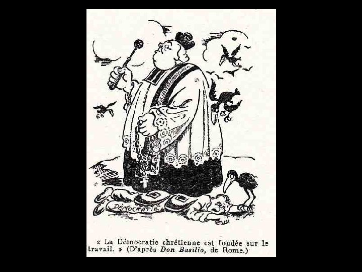 Il faudrait aussi évoquer, au XVIème, la remise en cause de la papauté par la Réforme qui n’hésite guère à publier textes et images, parfois scatologiques, présentant le pape sous la forme d’un monstre ou d’un démon ! Aux XVIIème et XVIIIème, La Fontaine, le marquis d’Argens (souvenons-nous du Père Dirrag et de son « cordon de Saint Antoine » ) et Voltaire, entre autres, ne se privent pas non plus de caricaturer représentants ou suppôts de l’Eglise. Au XXème siècle, la caricature anticléricale connaît son apogée. L’hebdomadaire Les Corbeaux puis le mensuel de la Libre Pensée : La Calotte, dont le nom est, déjà, tout un programme, dénoncent l’obscurantisme religieux et, prenant régulièrement pour cible la hiérarchie de l’Eglise, publient de très nombreux dessins satiriques.