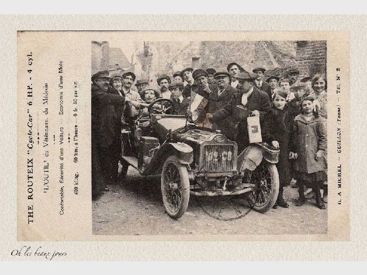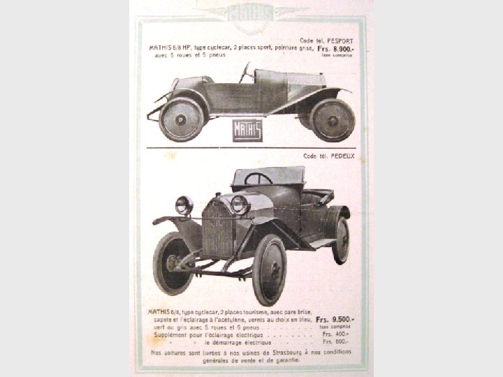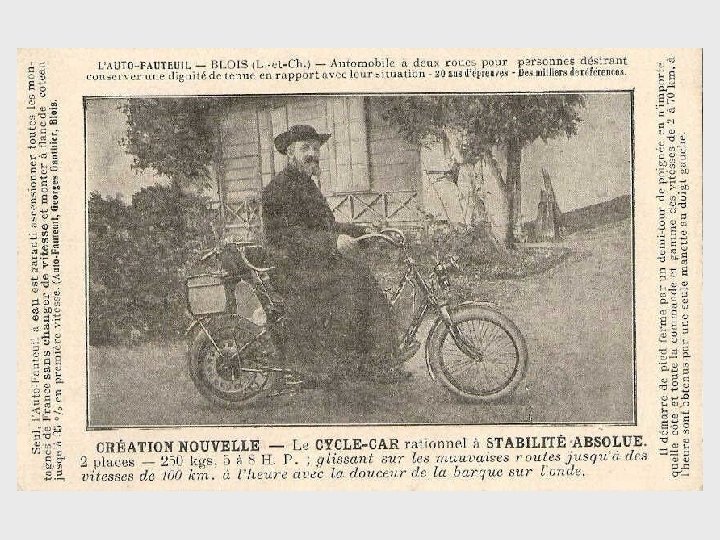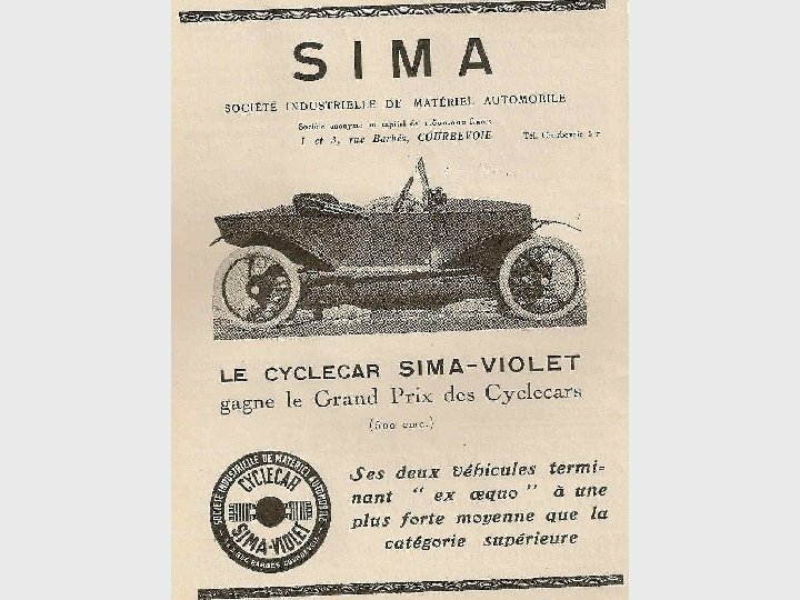 Au début des années vingt, la France donne un coup de pouce à l'idée de voiture populaire. La loi de finances du 30 juillet 1920 réduit à 100 francs la taxe annuelle sur les cyclecars qui doivent répondre aux critères suivants: Ø Véhicule à trois ou quatre roues Ø Deux places au maximum Ø Poids maximum: 350 kg Ø Cylindrée inférieure à 1100 cc