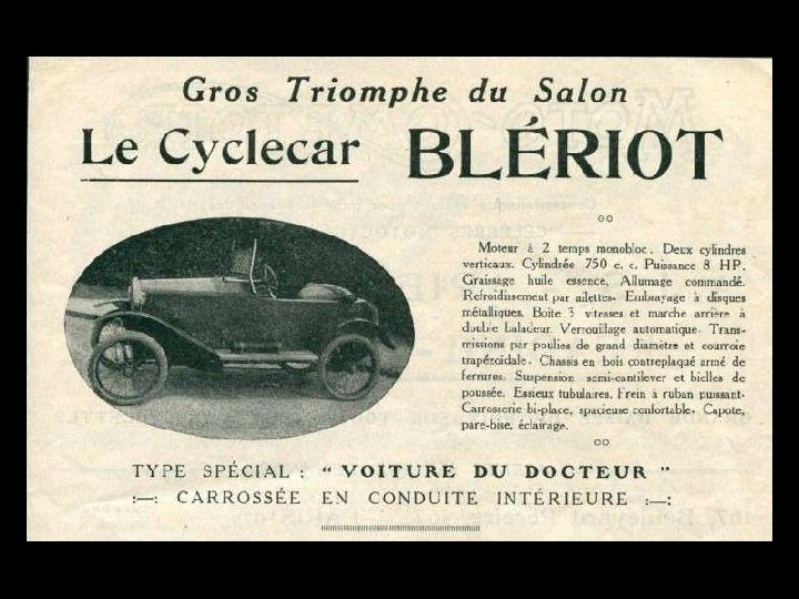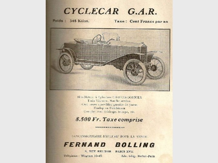 Au début des années vingt, la France donne un coup de pouce à l'idée de voiture populaire. La loi de finances du 30 juillet 1920 réduit à 100 francs la taxe annuelle sur les cyclecars qui doivent répondre aux critères suivants: Ø Véhicule à trois ou quatre roues Ø Deux places au maximum Ø Poids maximum: 350 kg Ø Cylindrée inférieure à 1100 cc