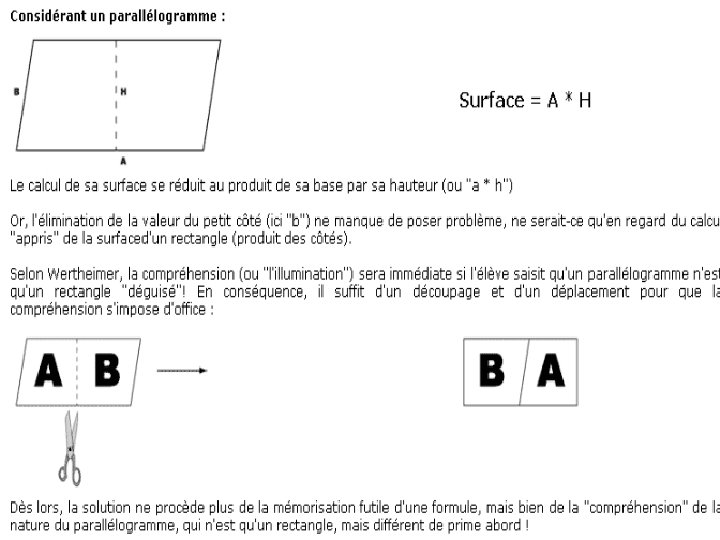 Théorie gestaltiste (Théorie de la forme) Vertheimer (1880 -1943), Koffka (1886 -1941), Köhler (1887 -1967) Nous percevons les objets de manière unifiée: les « totalités » donnent du sens aux parties. L’apprentissage doit faire appel à la compréhension par Insights et à une pensée véritablement créatrice, et non pas à des présentations d’éléments morcelés de connaissances, à relier progressivement entre eux par mémorisation (l’apprentissage par cœur).