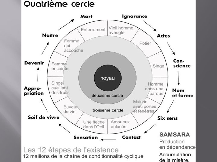Les douze liens causaux 1. ignorance 2. action 3. conscience dans la matrice 4. nom et forme 5. six entrées (sens) 6. contact 7. sensation 8. désir 9. attachement 10. existence 11. naissance 12. vieillesse et mort l
