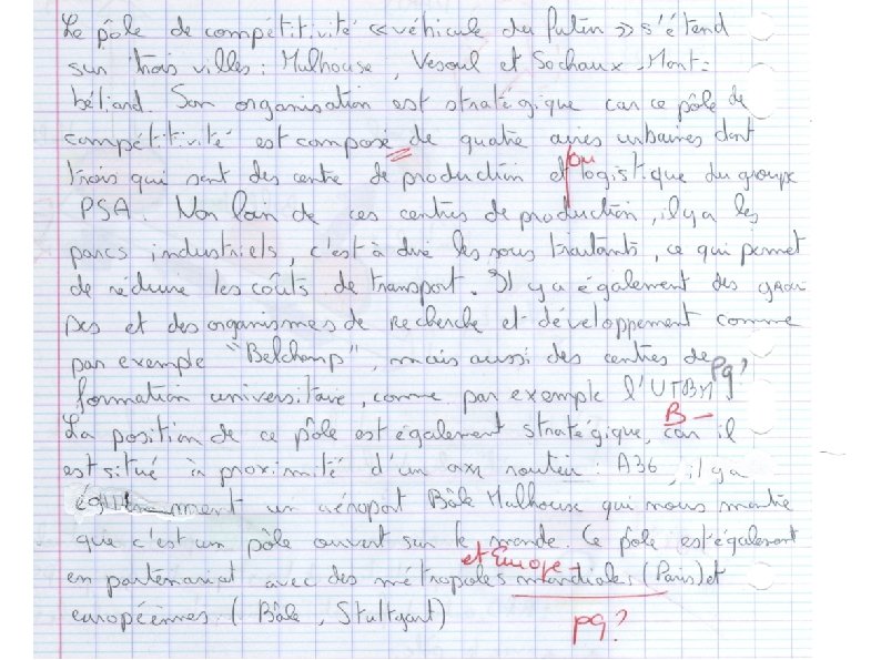 Changer d'échelle : ce pôle est inserré ds un espace + vaste : il dépend de la stratégie de la FTN PSA dont le siège social est à Paris il est relié aux grands réseaux de communication car situé sur l'axe Rhin-Rhône, axe européen il peut donc nouer des partenariats avec d'autres pôles européens ou être soumis au pouvoir d'attraction d'un pôle concurrent. > 2 parties de la légende Un territoire innovant fondé sur un savoir-faire : le pôle de compétitivité, véhicule du futur Un pôle de compétitivité connecté aux réseaux de transport et aux autres métropoles