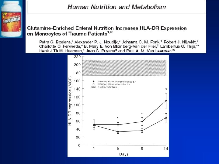Glutamine : AA immunomodulateur Glutamine : stock de l'organisme 80 g muscle synthèse protéique bilan azoté intestin trophicité / fonction Gln immunité infections bénéfice clinique Mécanisme protecteur cellulaire HSP, GSH, ATP Fish et al, Am J Clin Nutri 1997; 6: 977 -83, Griffiths RD et al, Nutrition 1997; 1: 295 -302