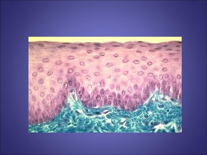 3 -Epithéliums stratifiés - PAVIMENTEUX STRATIFIÉ (= malpighien) 1. Pavimenteux stratifié non kératinisé: E. oesophagien. 2. Pavimenteux stratifié kératinisé: épiderme - CUBIQUE STRATIFIÉ: portion terminale des glandes sudoripares - PRISMATIQUE STRATIFIÉ