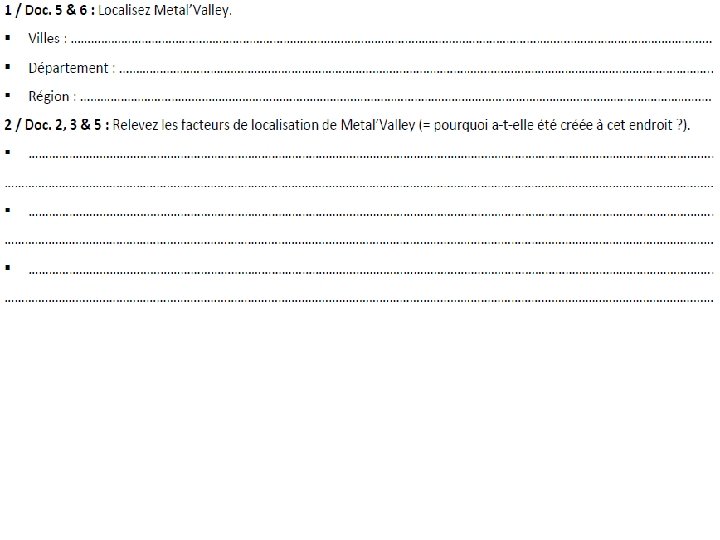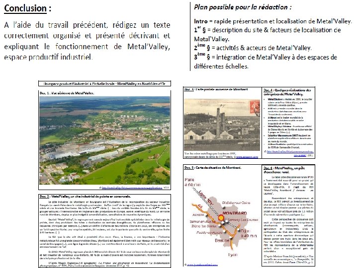 1 / Doc. 5 & 6 : Localisez Metal’Valley. Villes : Montbard & Venarey - Les Laumes. Département : Côte-d’Or. Région : Bourgogne. 2 / Doc. 2, 3 & 5 : Relevez les facteurs de localisation de Metal’Valley (= pourquoi s’est-elle créée à cet endroit ? ). § Une tradition industrielle et un savoir-faire ancien. § Un cours d’eau indispensable à l’industrie métallurgique. § La proximité d’axes de communication majeurs en France (canal de Bourgogne, LGV, autoroute A 6).