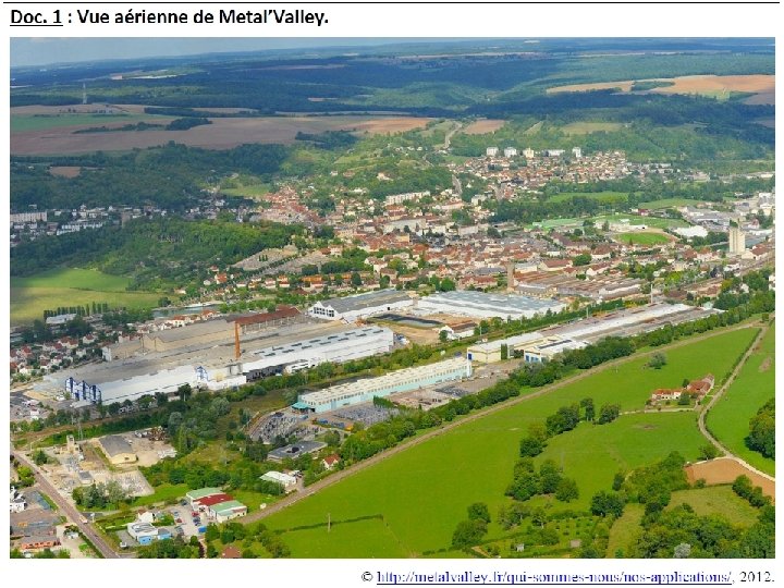 4 / Doc. 1, 2 & 4 : Justifiez le titre du document 2. § « un site industriel de pointe » : 8 entreprises spécialisées dans la métallurgie de pointe (voir ex. doc. 4). § « en zone rurale » : une zone peu densément peuplée et composée d’espaces forestiers et agricoles. 5 / Doc. 2 & 6 : Relevez les différents acteurs participant à Metal’Valley. § Les entrepreneurs (de Metal’Valley & du Club des entrepreneurs de l’Auxois). § Les élus locaux (municipalités de Montbard, Venarey, Semur). § L’Etat (qui intervient avec des subventions).