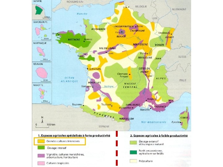 Les espaces agricoles français Bassin Parisien Bretagne Alsace Aquitaine 1. Espaces agricoles spécialisés à forte productivité Grandes cultures céréalières Elevage intensif Vignoble, cultures maraîchères, arboriculture 2. Espaces agricoles à faible productivité Polyculture et élevage extensif