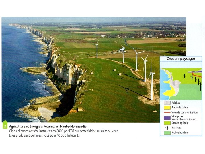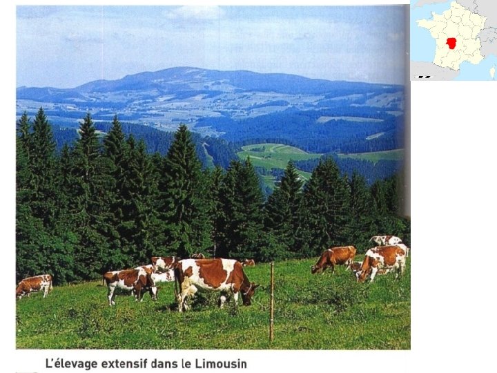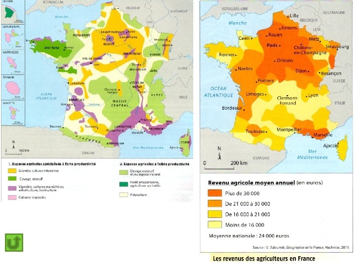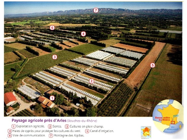 1. Espaces agricoles à forte productivité = espaces intégrés aux marchés mondiaux et européens 2. Espaces agricoles à faible productivité = espaces en marge des marchés mondiaux et européens Type d’agriculture - Agriculture productiviste : mécanisation, usage importants d’engrais, de pesticides pour obtenir des rendements très élevés - Production destinée au marché national, européen et mondial Agriculture peu rentable Enjeux - Rester compétitif face à la concurrence européenne et mondiale innover, miser sur la qualité des produits - Limiter les atteintes à l’environnement (ex : phénomène des algues vertes sur les plages bretonnes) Maintenir une activité agricole (et donc des habitants) en développant l’agriculture biologique par exemple ou encore les labels (garantie d’origine et/ou de qualité)