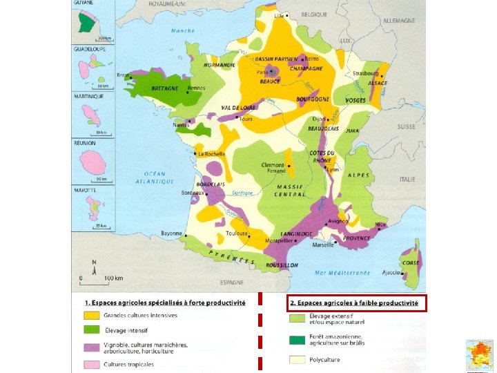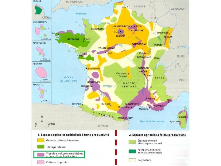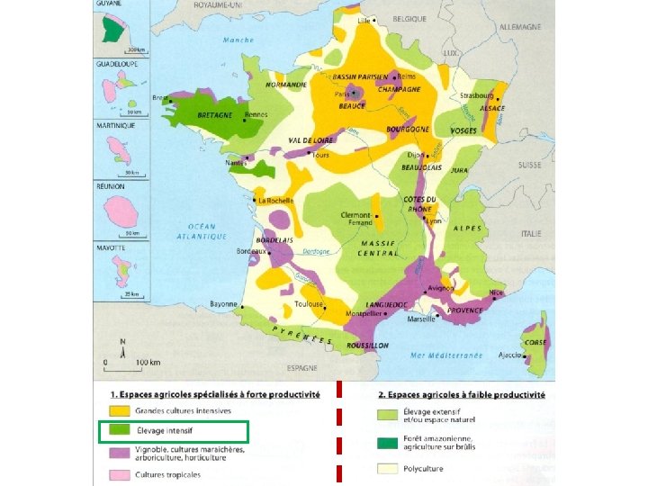 Les espaces agricoles français Bassin Parisien Bretagne Alsace Basse vallée du Rhône Aquitaine 1. Espaces agricoles spécialisés à forte productivité Grandes cultures céréalières Elevage intensif Vignoble, cultures maraîchères, arboriculture Languedoc Provence 2. Espaces agricoles à faible productivité Polyculture et élevage extensif