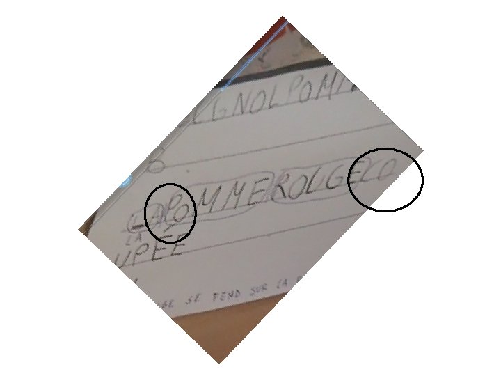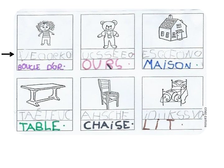 PE : Ici, tu as écrit le début du mot ROUGE, tu as vu ? Regarde comment on écrit ROUGE : R-O-U-G -E (l’enseignante épelle le mot en l’écrivant sur la feuille de l’enfant). Voilà le mot ROUGE ! Lohen : (relit le début du mot « ROUGE » qu’il avait commencé à écrire tout en l’épelant) J’ai fait un R, un O, un U (puis il complète son mot : il écrit la lettre G) Voilà, j’ai fait le G (enfin, il écrit le dernier E) et le E. C’est bon, j’ai fait le G et le E!»