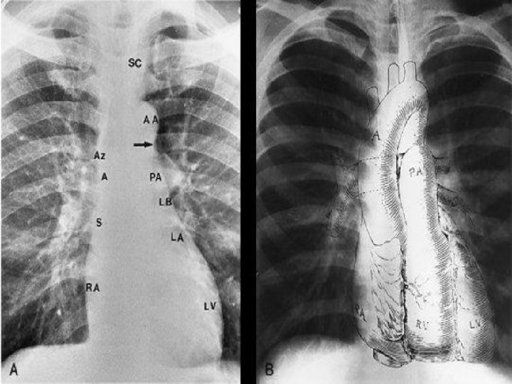 � Au niveau du bord droit , on décrit : un arc supérieur et un arc inférieur. 1 - L’arc supérieur droit, rectiligne ou légèrement concave, est constitué du tronc veineux brachiocéphalique et de la veine cave supérieure. 2 - L’arc inférieur droit, convexe, est constitué du bord latéral de l’oreillette droite et de la veine cave inférieure. � Au niveau du bord gauche , on décrit 3 arcs : supérieur gauche, moyen gauche et inférieur gauche. 1 - L’arc supérieur gauche correspond à l’artère subclavière gauche et à la portion horizontale de la crosse aortique(le bouton aortique). 2 -L’arc moyen gauche correspond au tronc de l’artère pulmonaire dans ses 2/3 supérieurs et à l’auricule gauche dans son 1/3 inférieur. 3 -L’arc inférieur gauche correspond au ventricule gauche