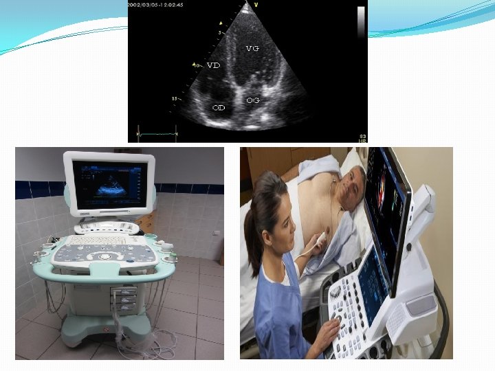 Echocardiographie � Est également une méthode non invasive, basée sur la transmission des ultrasons et qui permet de visualiser le coeur. � Elle permet l'étude fonctionnelle et anatomique du ventricule gauche et l'étude dès valves.
