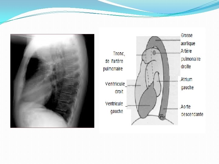-Le cliché de profil : se prend le côté malade sur la plaque, les bras levés. La silhouette cardiaque est délimitée en avant et en bas par l'arc antérieur, à bords flous, constitué par le ventricule droit et en arrière, le bord postéro-inférieur constitué de haut en bas par les bords postérieurs de l'oreillette gauche et du ventricule gauche