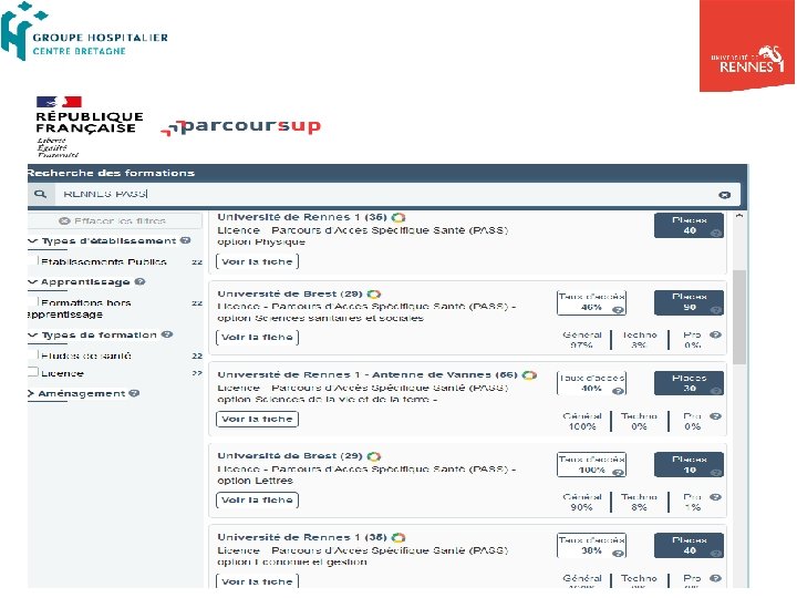 6 options sont disponibles en PASS à Rennes Options disciplinaires en PASS à Rennes PASS - Option Sciences Infirmières Places parcoursup 2020 100 PASS - Option Biologie Environnement Chimie du vivant 160 places PASS - Option Economie et Gestion 40 places PASS - Option Informatique 40 places PASS - Option Mathématiques 40 places PASS - Option Physique Chimie Géosciences 120 places PASS – Option Psychologie 40 places PASS - Option Sciences et Vie de la Terre 30 places PASS - Option Droit 20 places Total 590 places 85 places en médecine 7