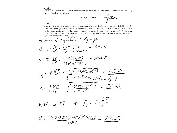 L’équation des gaz parfaits • Exemple: Calculez le volume (en litres) qu’occupent 2. 12 moles de monoxyde d’azote (NO) à 6. 54 atm et à 76 o. C. • Solution: T = 349 K V = 9. 29 L