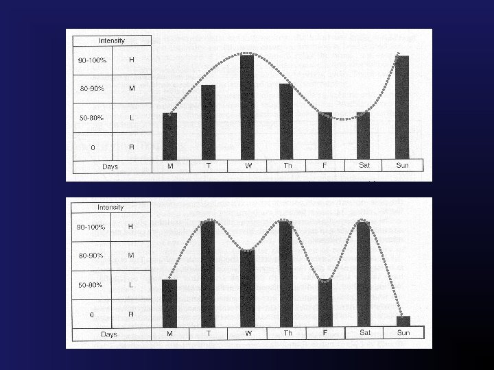 Intensité Début Période d’augmentation de saison de la charge Maximale Période de pré compétition Période d’affûtage Elevée Moyenne Faible Régénération Exemple de profils de microcycles en fonction des périodes d’une saison d’entraînement
