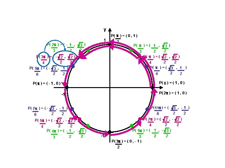 Coordonnées équivalentes du cercle trigonométrique Ex. : Déterminer les coordonnées du point correspondant sur le cercle trigonométrique. Exprimer la valeur exacte lorsque c’est possible. e) - 8 6 rad