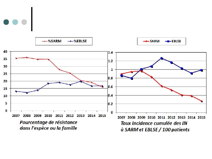 LES GERMES en 2015 TOP 5 PSE AER – 15, 1% (19% PNE, 10% BN) STA AUR – 10, 6% (17% BLC et 12% PNE) ESC COL – 8, 8% (10, 4% BAC et 9, 5% PNE) STA EPI – 9, 6% (27% CVC +) KLE PNE – 7% (8, 3% BAC et 7, 2% PNE) ¯ SARM ↑ EBLSE ↑ résistance au carbapénèmes chez les Acinetobacter et les Pseudomonas + EPC