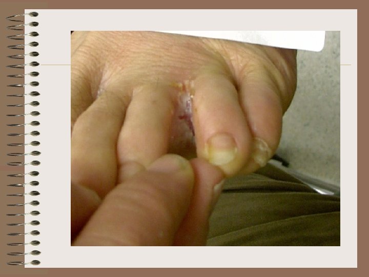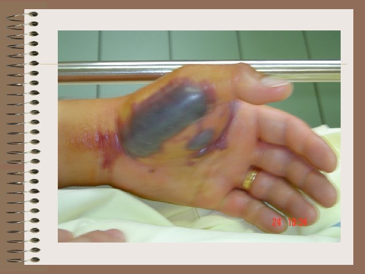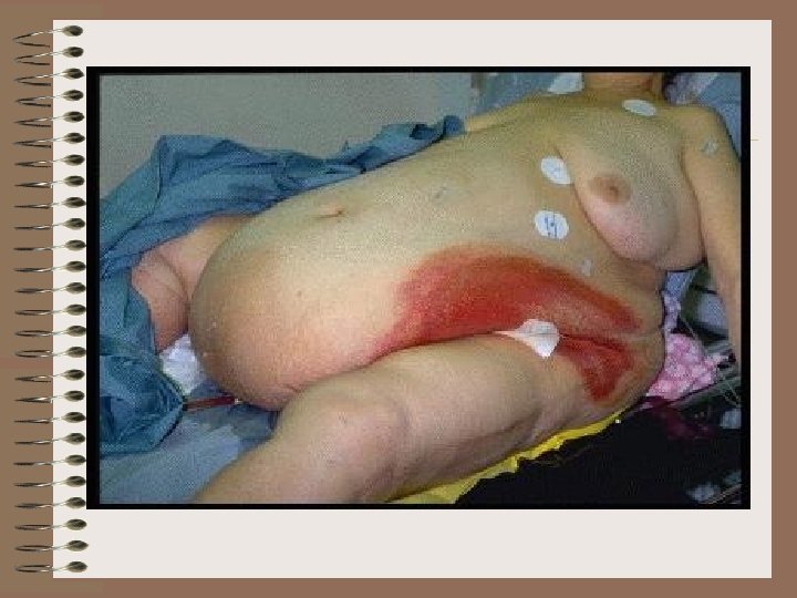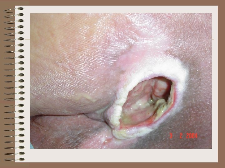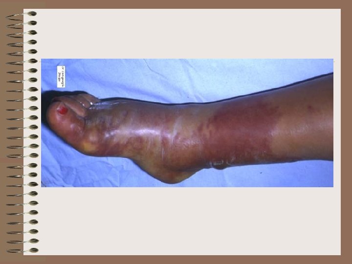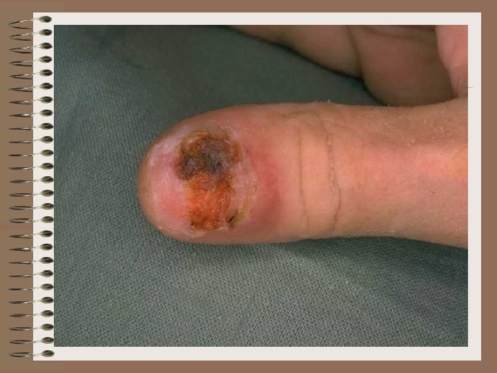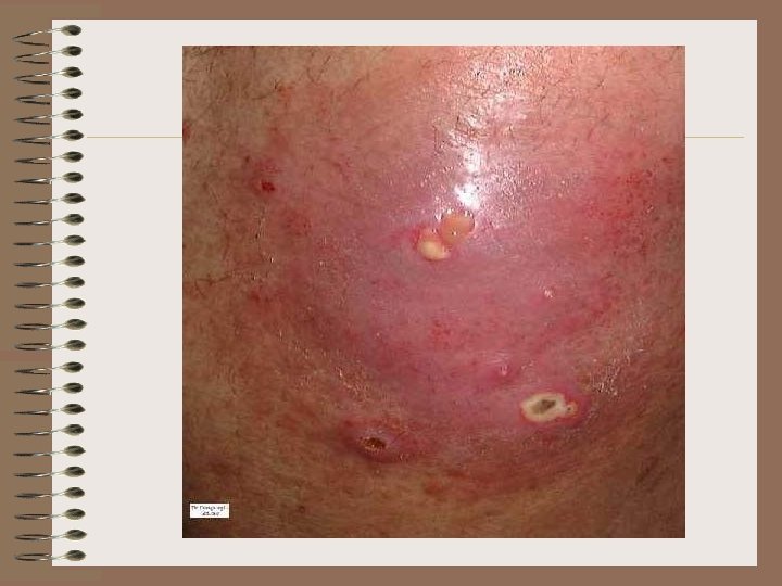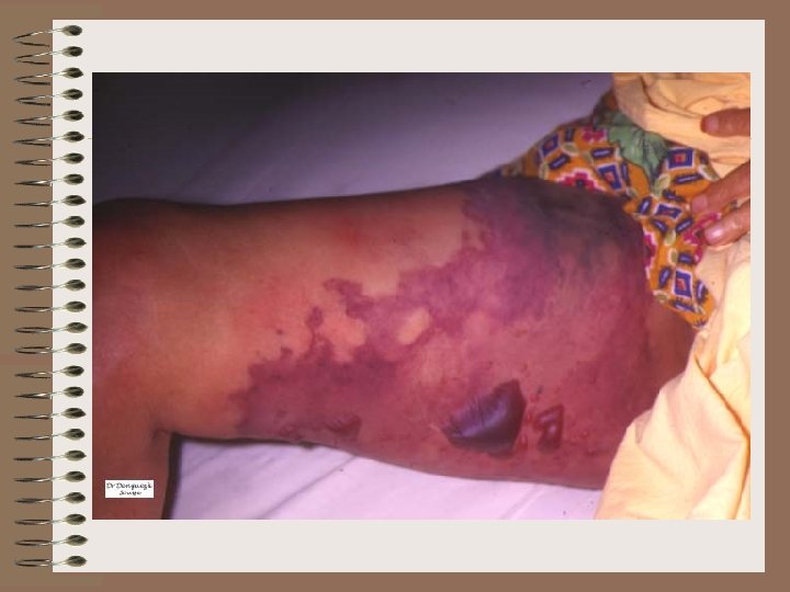 • CLINIQUE : • • • Ecoulement +/- purulent Nécrose Odeur nauséabonde Crépitation sous-cutanée Adénopathies Fièvre • COMPLICATIONS : • Phlegmon, abcès, cellulite, ostéo-arthrite, septicémie
