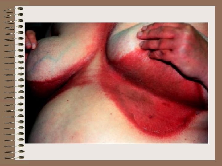 A- Infections superficielles 4 - Intertrigos : dermite inflammatoire des plis Favorisée par : - Contact permanent de 2 surf. Cutanées + Hyperhidrose - Macération, hygiène, obésité, diabète Cocci gram+ : genre strepto ou staph Bacilles gram. Champignons : candida ou dermatophytes